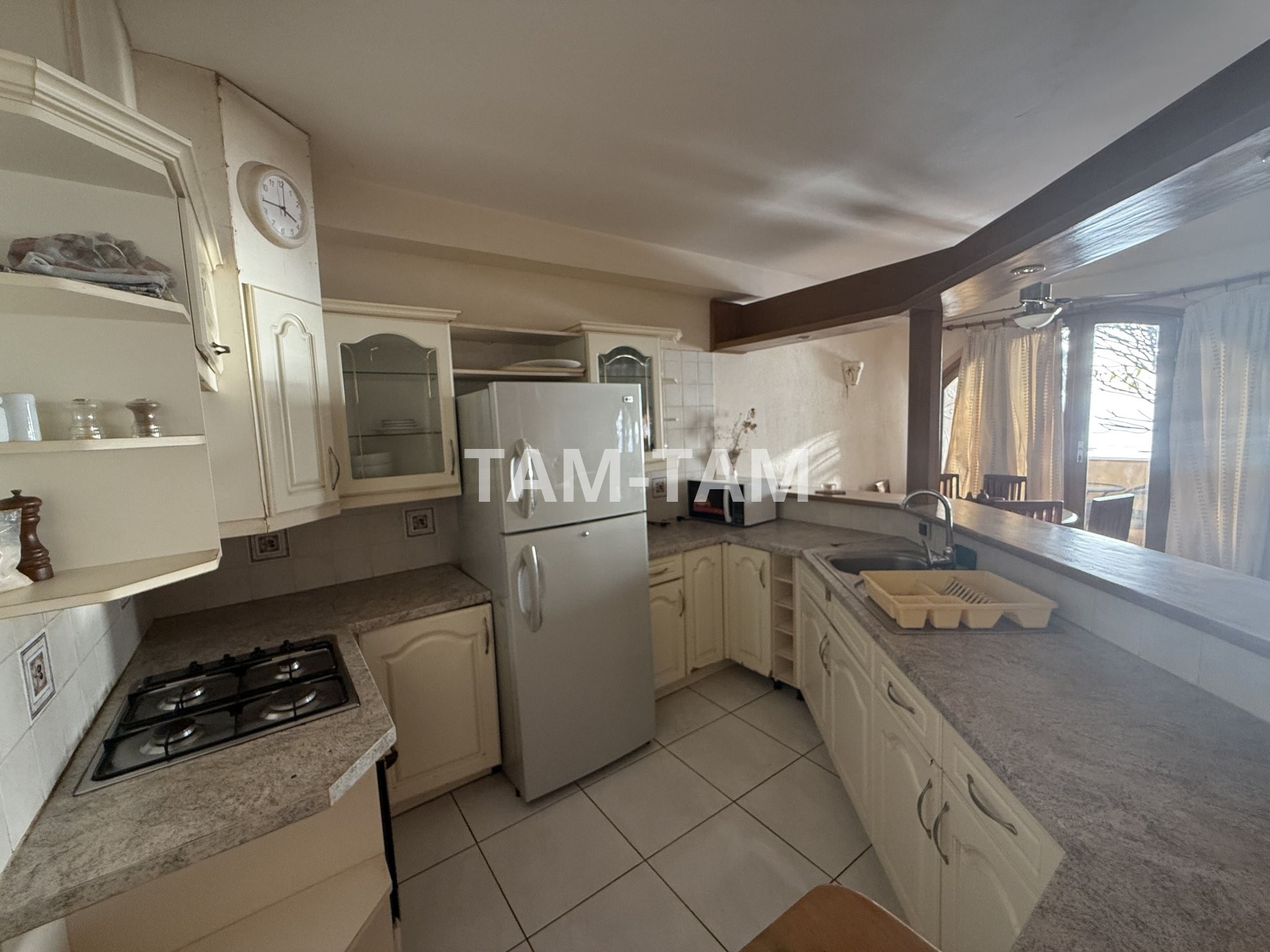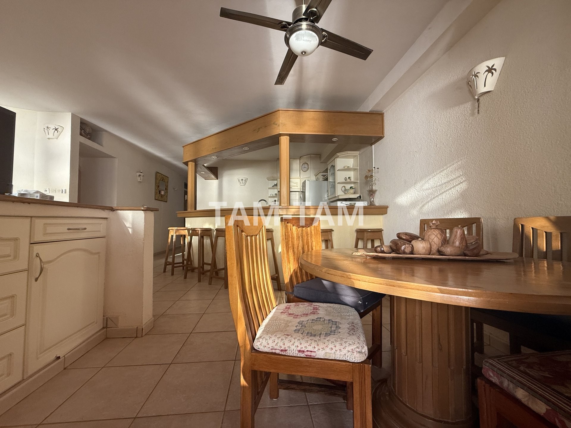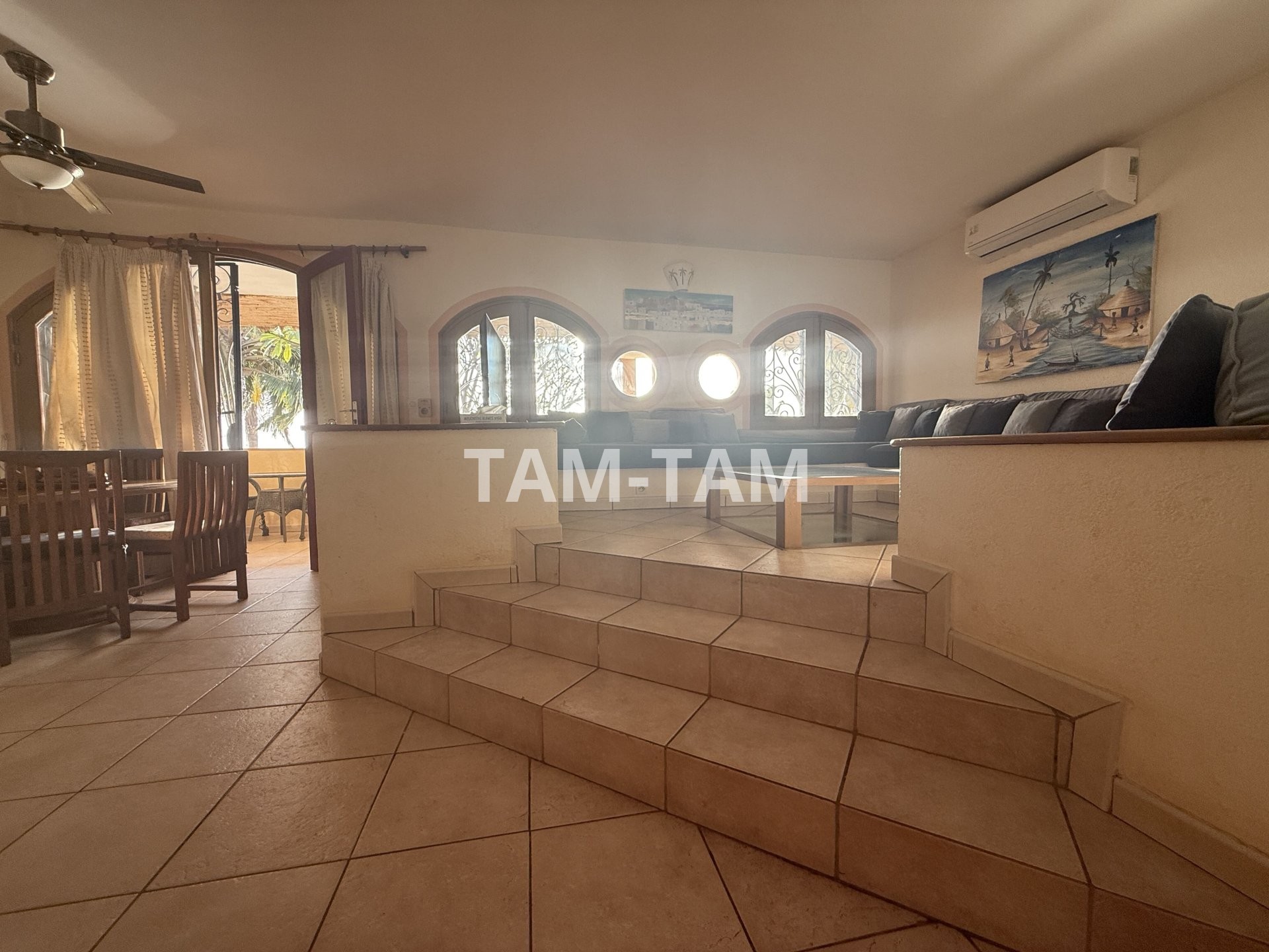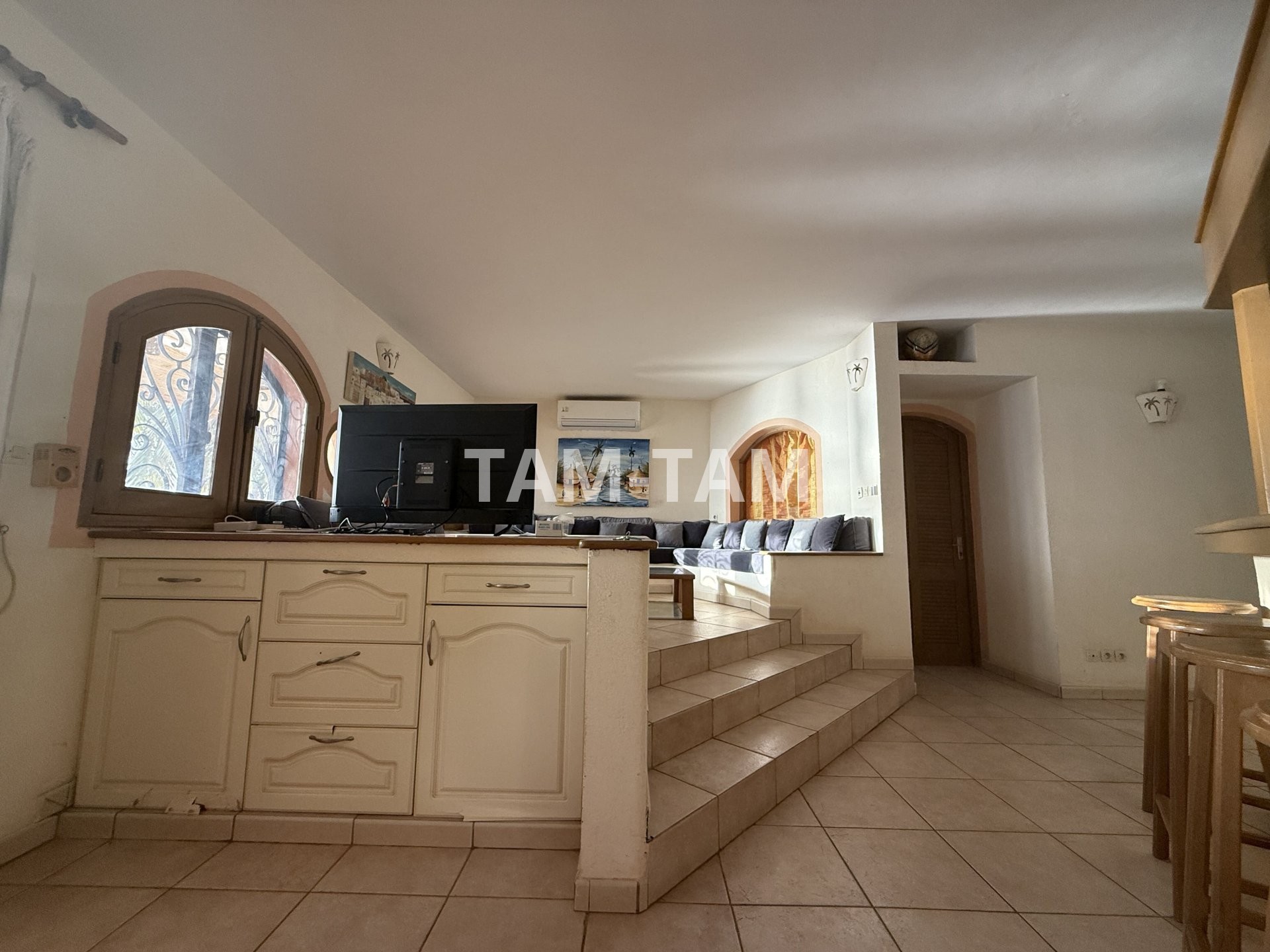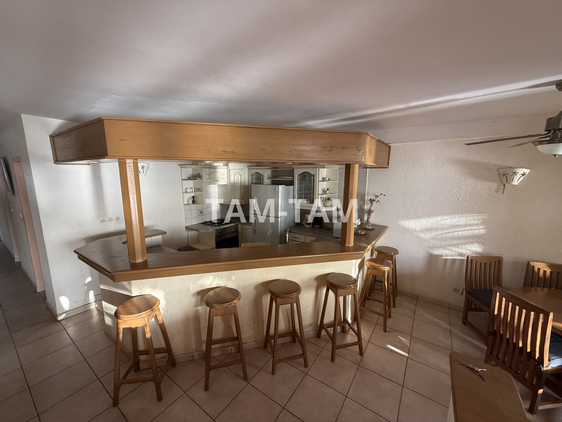Description de l'Appartement : Un beau séjour avec un salon surélevé pour profiter au maximum de la vue mer, une cuisine américaine aménagée et équipée.
