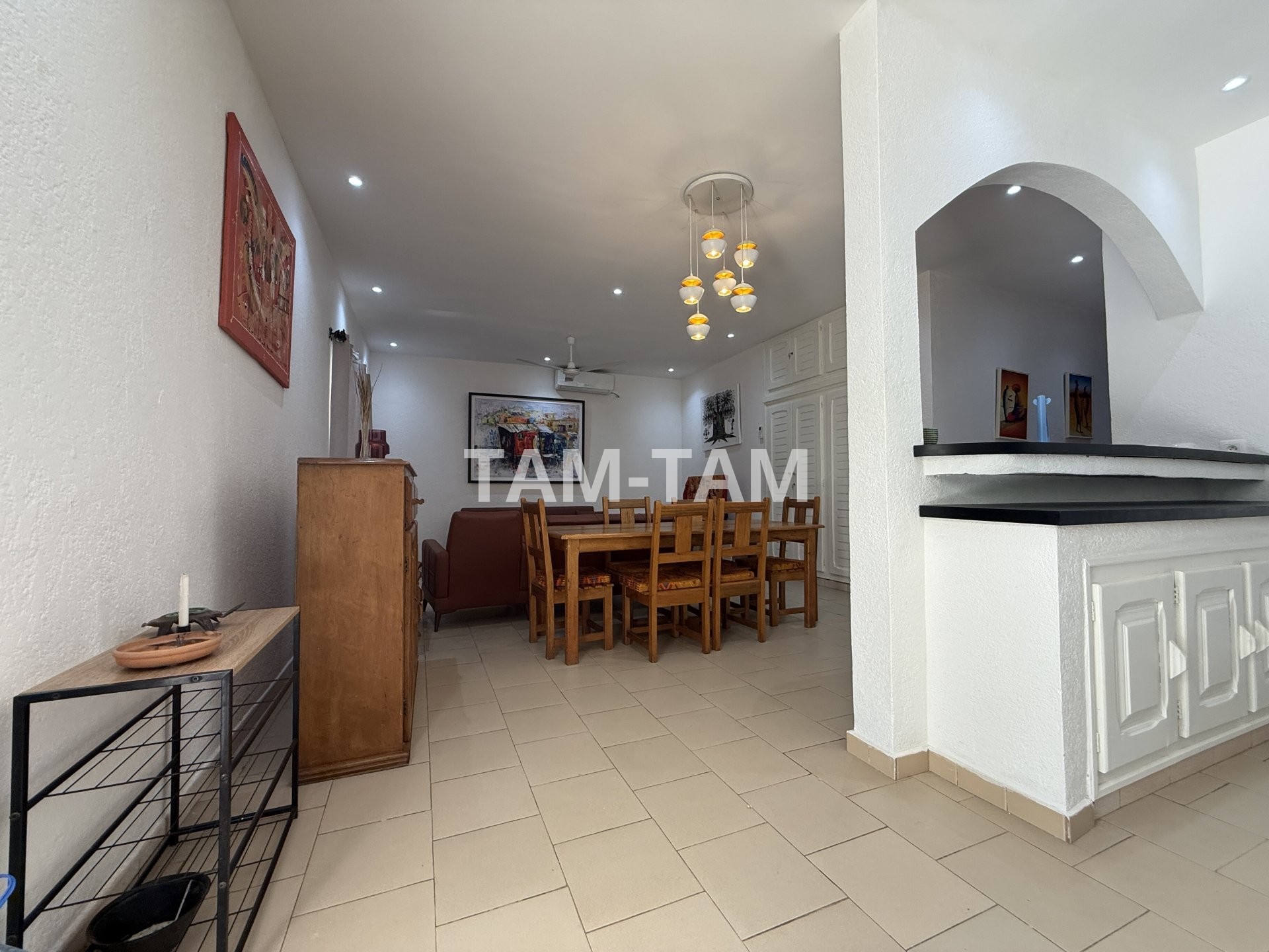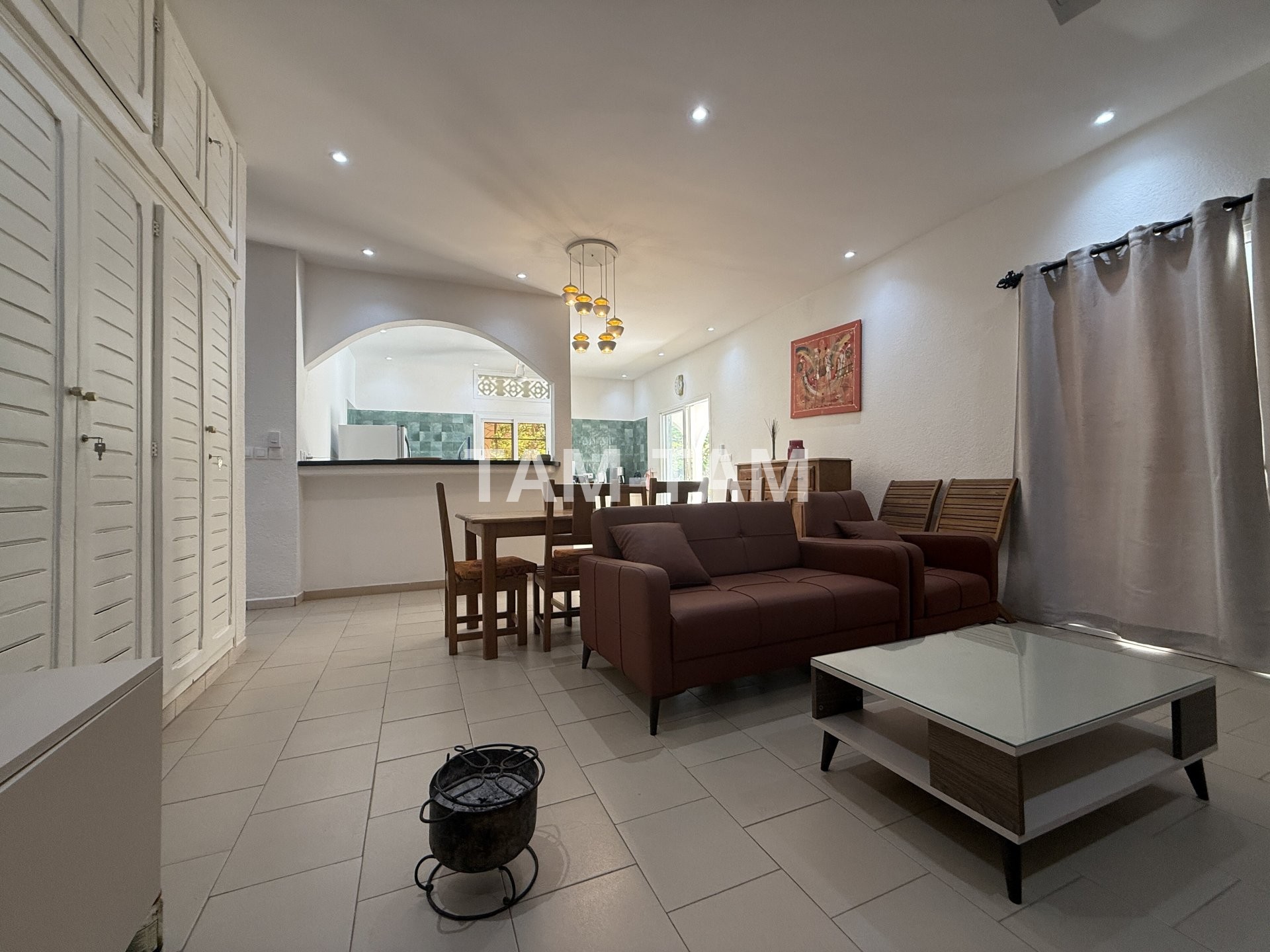 Un séjour lumineux avec une cuisine américaine aménagée et équipée.