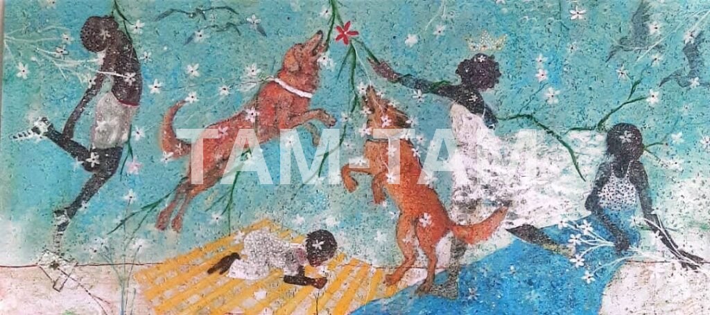 Alhassane met en scène des enfants, des fleurs et des animaux face à face. Un dialogue semble s’instaurer entre l’enfant et la fleur. L’enfant sait d’instinct que la fleur est vivante et fragile au même titre que lui. La force de la fleur, dépendra de celle de l’enfant.