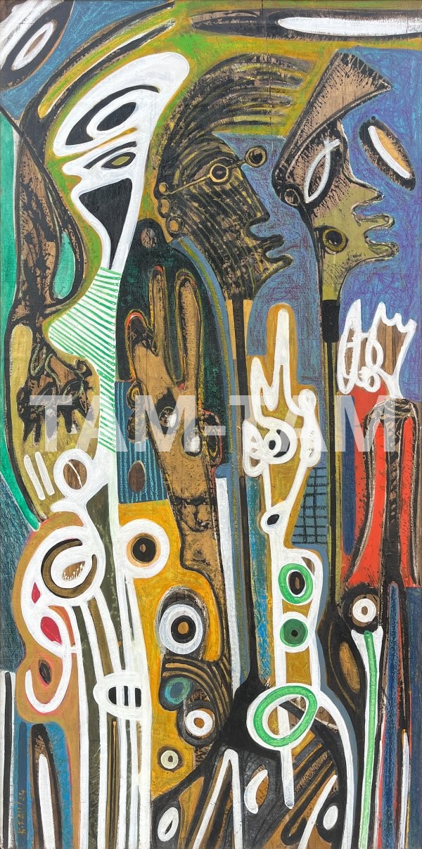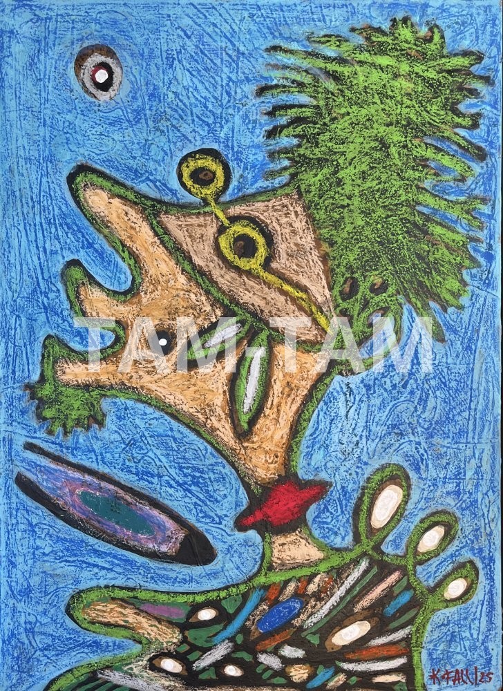Kara Fall est un artiste plasticien né en 1971 basé au Sénégal et d’origine dogon (Mali). Son œuvre mêle peinture, installation et musique dans une démarche profondément multidisciplinaire. À la croisée des arts visuels et sonores, il explore les relations entre les formes, les rythmes et les récits, au service d’une expression libre et puissamment évocatrice.