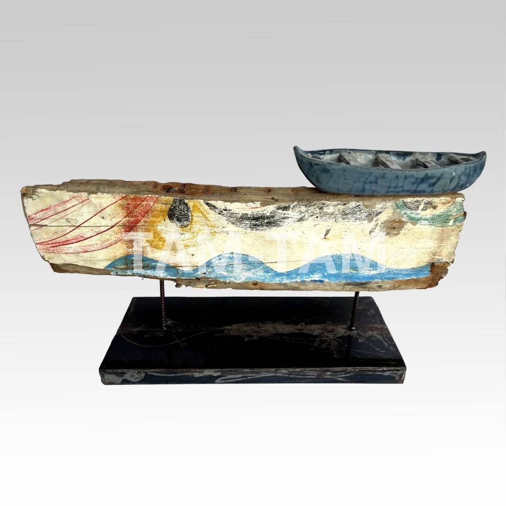Dans sa série « Fish and Ships », Elle mélange de l’argile sénégalaise, transformée en céramique, avec des morceaux de pirogue échoués, mettant ainsi en lumière une économie en détresse.