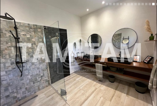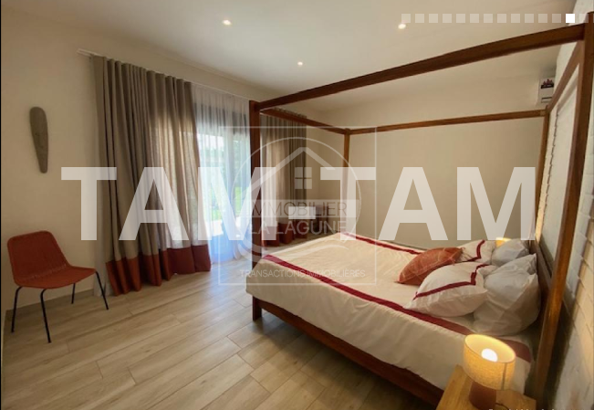 Villa à vendre à Ngaparou. Superbe villa neuve à étrenner de 270m2 habitables, joliment meublée et décorée, implantée sur un beau terrain de 1400m2 entièrement gazonné. Prestation et matériaux de qualité (volets roulants électriques, éclairage et piscine sur solaire, ... ). Elle bénéficie d'un vaste séjour lumineux avec coin salon TV, coin repas, et cuisine américaine équipée, de 3 grandes chambres avec salles d'eau privatives et placards, 1 grande chambre indépendante pouvant accueillir un bureau, une salle de sport...Un charmant salon d'été très cosy face à sa piscine à débordement 12X6 et face à son jardin gazonné et arboré. Garage fermé pour 1 véhicule et 1 quad, une cours pavée, une chambre de personnel. Idéalement située dans un quartier sécurisé et maîtrisé, à proximité de l'Ecole Bilingue (EBA), et à 2,5 Km des commerces et de l'Océan.