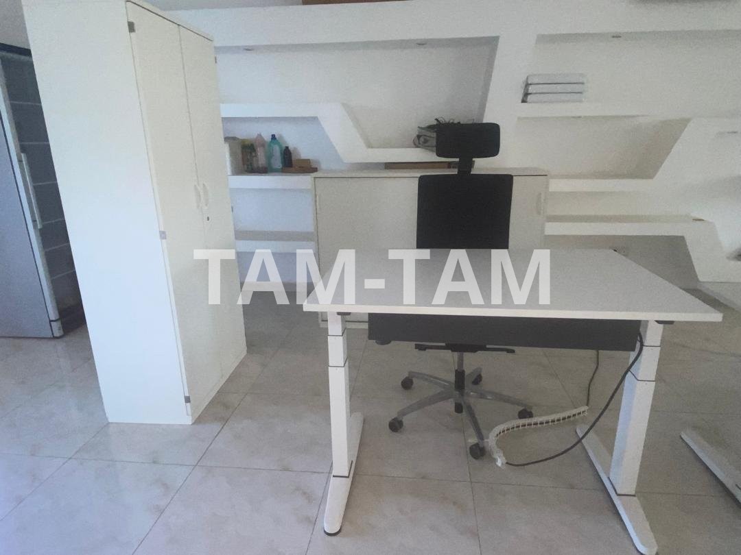 * Bureau : Table de travail blanche avec plateau rectangulaire et piétement en métal robuste assorti. Structure sobre et moderne.