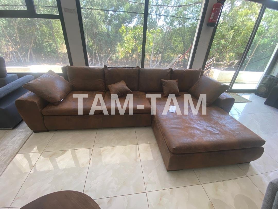 superbe canapé d'angle avec méridienne à droite, coloris marron terracotta. Son revêtement en tissu microfibre (effet nubuck/cuir retourné) est à la fois robuste et très doux au toucher.