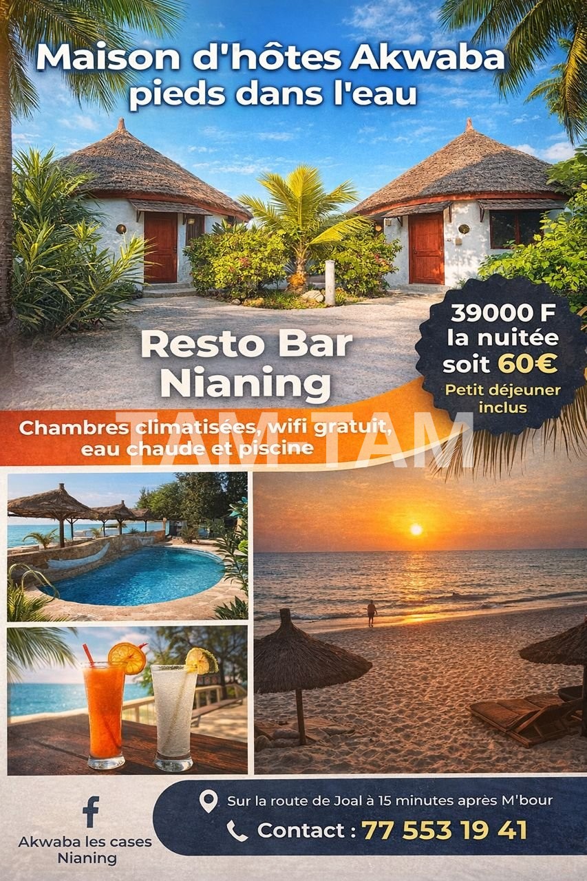 * Adresse : Sur la route de Joal, à seulement 15 minutes après M'bour, dans le village de Nianing.