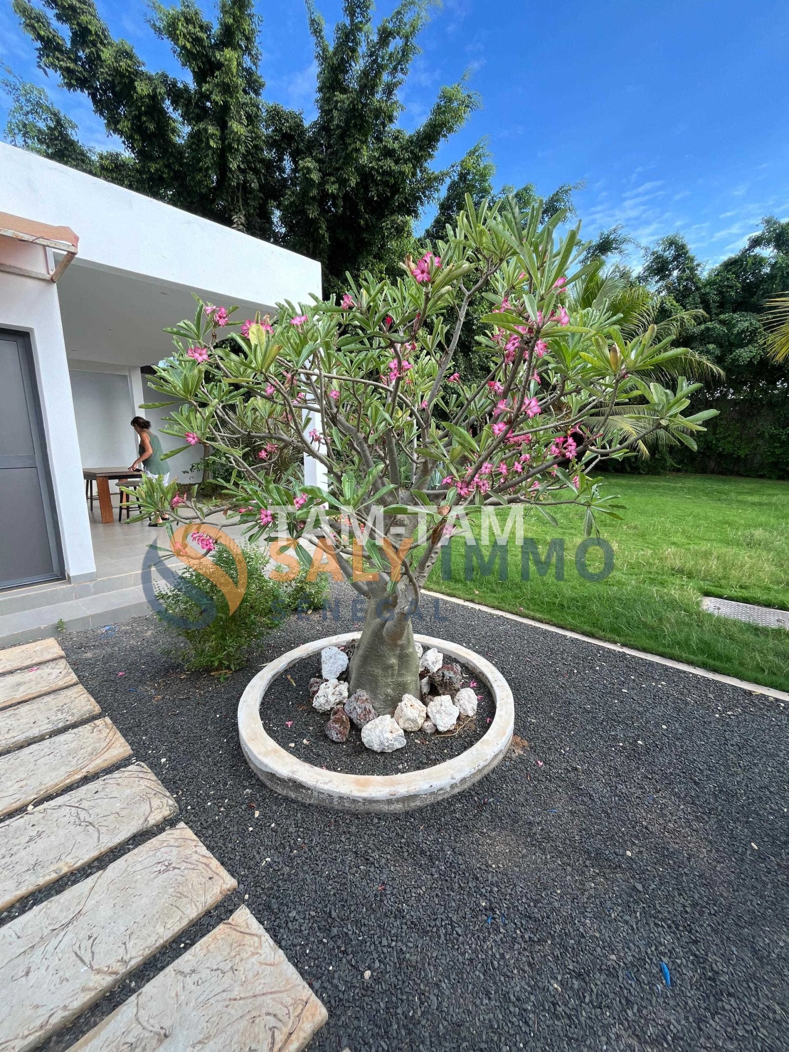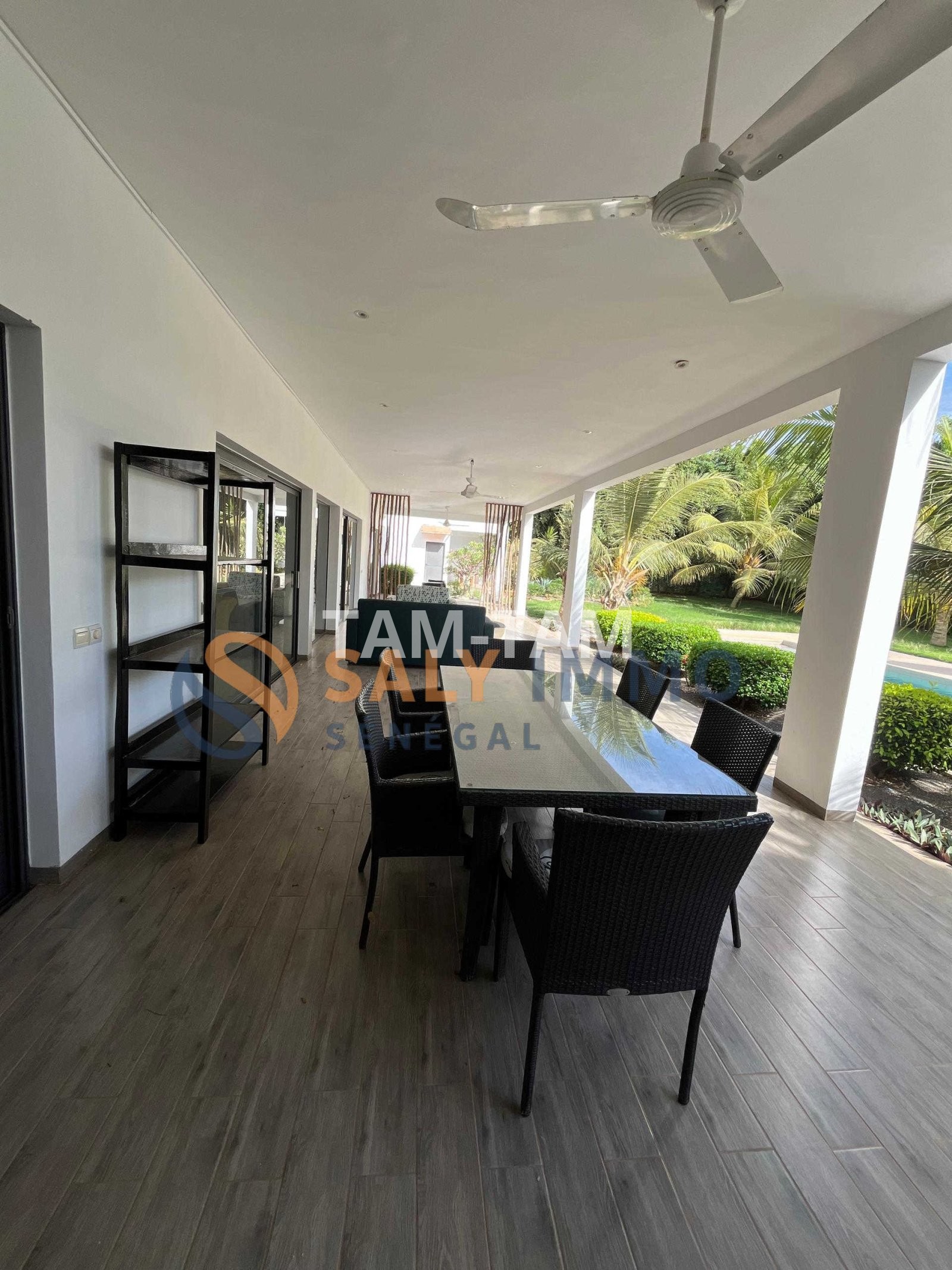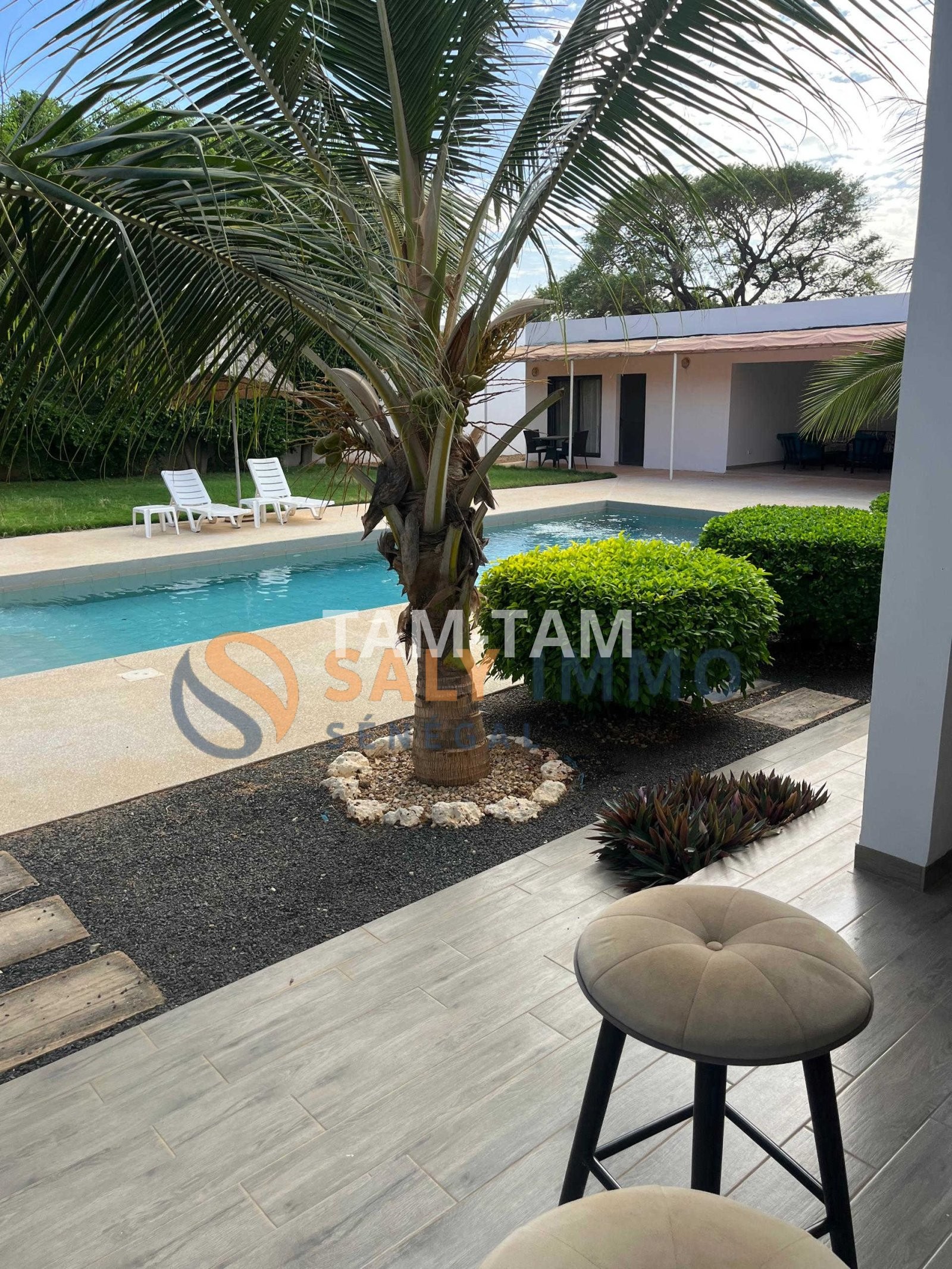 Dès l’extérieur, vous serez charmé par un jardin très bien entretenu et une végétation soigneusement taillée qui apporte une touche de fraîcheur et d’harmonie. Les portes en bois du salon ajoutent un charme naturel et authentique à l’ensemble. Le salon, joliment décoré, offre un espace vaste, lumineux et accueillant, idéal pour recevoir. Il donne directement sur une terrasse de style Palazzo, parfaite pour profiter des moments de détente en plein air.