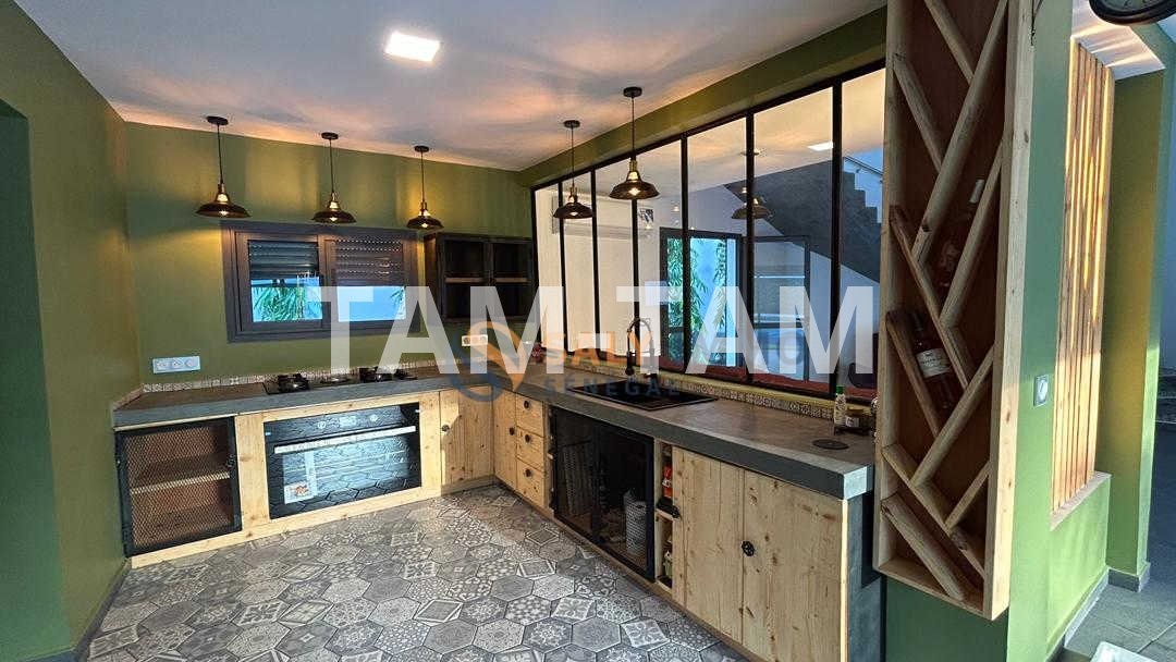Le salon-séjour lumineux s’ouvre sur une cuisine américaine entièrement équipée, alliant design et fonctionnalité. Une salle d’eau visiteurs, une arrière-cuisine, et de nombreux espaces de rangement complètent l’intérieur.