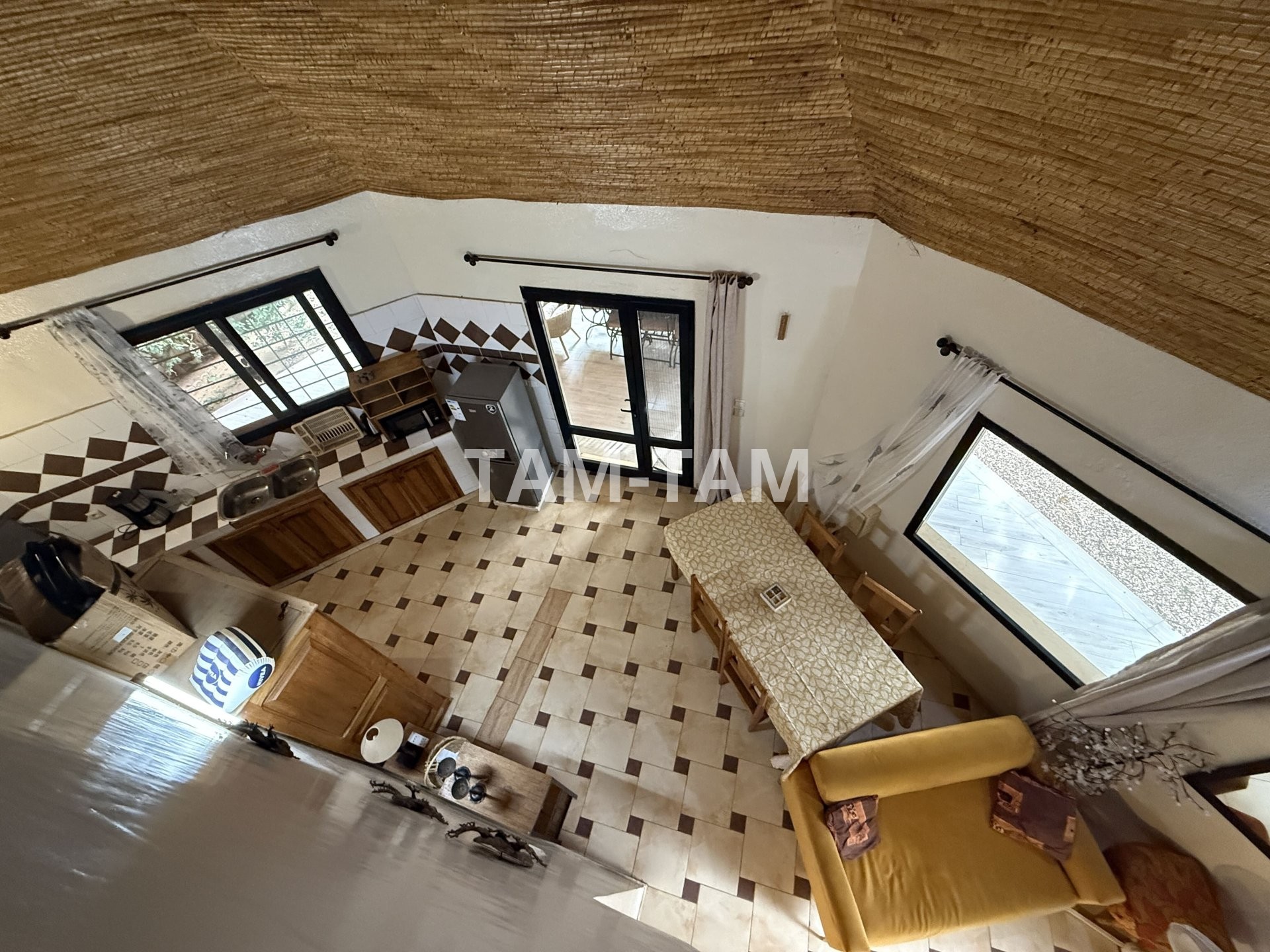 Rez-de-chaussée : un séjour, une cuisine américaine aménagée et équipée, une chambre avec salle d'eau et wc