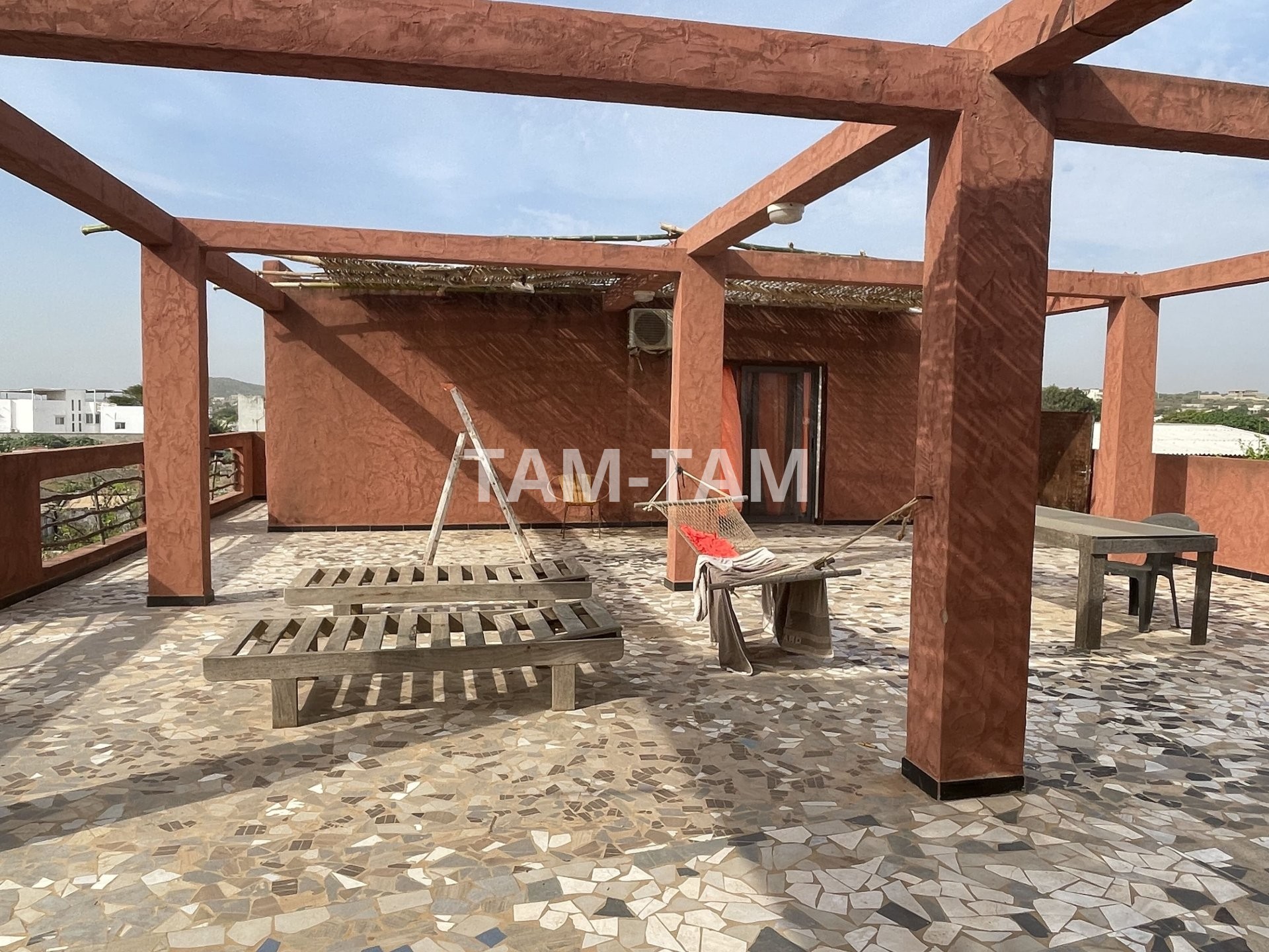 Terrasse panoramique de 130 m², véritable rooftop naturel pour détente, yoga, solarium ou soirées en plein air.