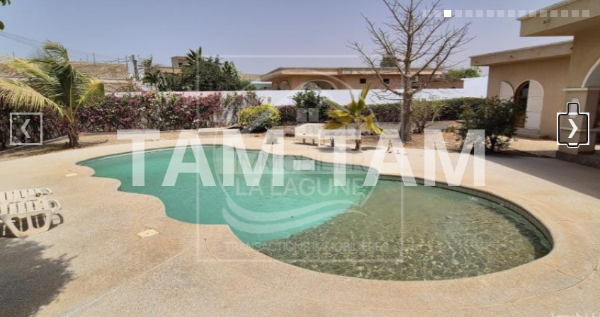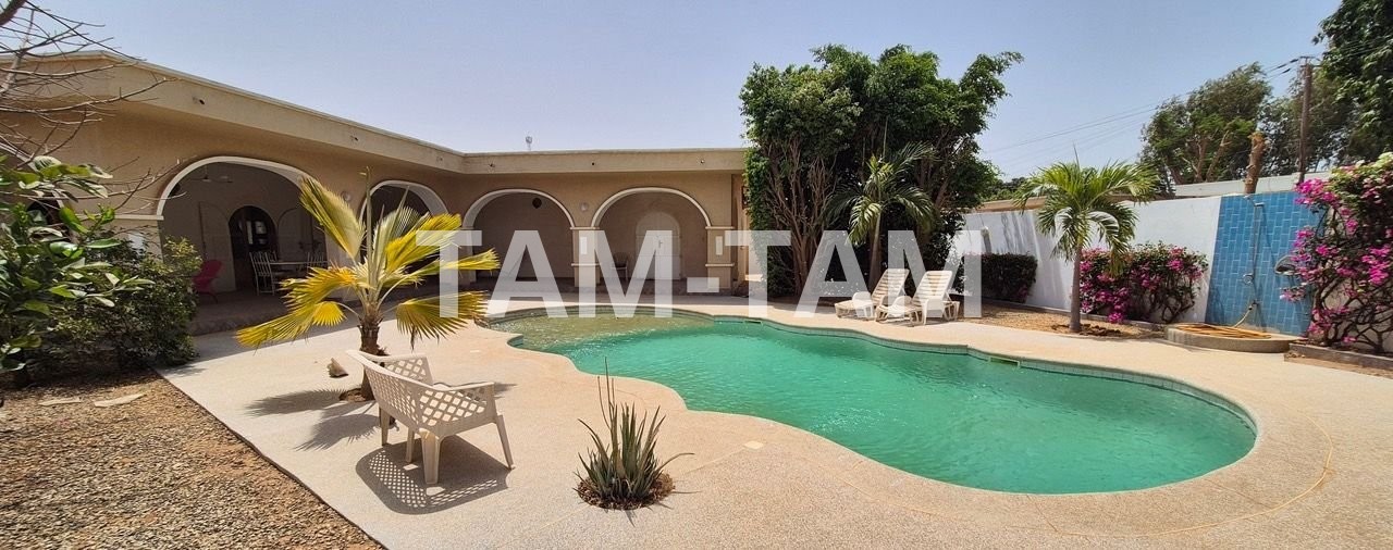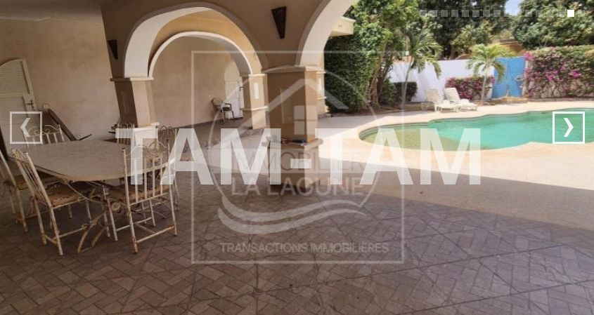 villa meublée, salon-séjour, cuisine américaine, cuisine fermée sénégalaise, 3 chambres , 3 salles d'eau, 1 chambre indépendante avec salle d'eau, wc invité, climatisations, parabole TV, brasseurs d'air