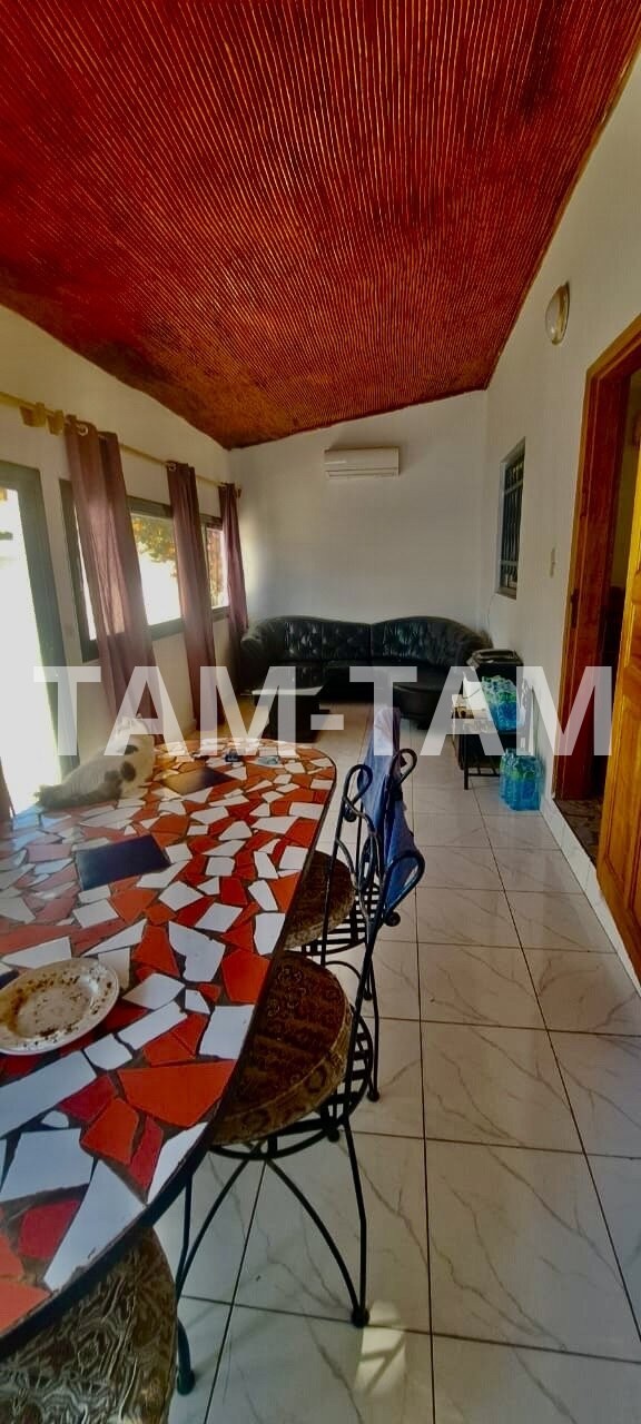 Rez-de-chaussée : une véranda aménagée en salon agrandit l’espace de vie, une salle à manger ouverte sur une cuisine américaine équipée, et une chambre climatisée avec salle d’eau indépendante.